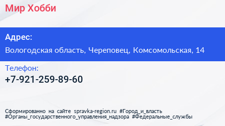 Мир Хобби по адресу Вологодская область, Череповец, Комсомольская, 14 в дальнейшем Организация, размещена в следующих категориях:
