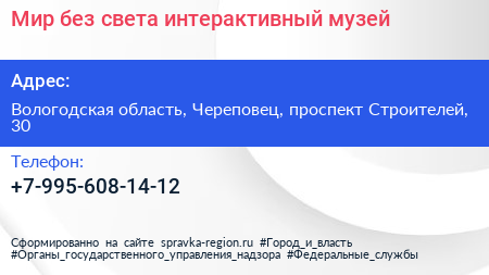 Мир без света, интерактивный музей по адресу Вологодская область, Череповец, проспект Строителей, 30 в дальнейшем Организация, размещена в следующих категориях: