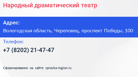 Народный драматический театр по адресу Вологодская область, Череповец, проспект Победы, 100 в дальнейшем Организация, размещена в следующих категориях: