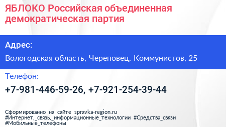 ЯБЛОКО, Российская объединенная демократическая партия по адресу Вологодская область, Череповец, Коммунистов, 25 в дальнейшем Организация, размещена в следующих категориях: