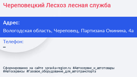 Череповецкий Лесхоз, лесная служба по адресу Вологодская область, Череповец, Партизана Окинина, 4а в дальнейшем Организация, размещена в следующих категориях: