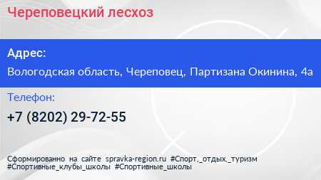 Череповецкий лесхоз по адресу Вологодская область, Череповец, Партизана Окинина, 4а в дальнейшем Организация, размещена в следующих категориях: