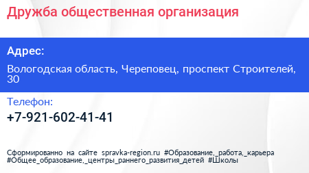 Дружба, общественная организация по адресу Вологодская область, Череповец, проспект Строителей, 30 в дальнейшем Организация, размещена в следующих категориях: