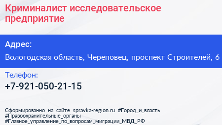 Криминалист, исследовательское предприятие по адресу Вологодская область, Череповец, проспект Строителей, 6 в дальнейшем Организация, размещена в следующих категориях: