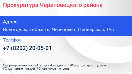 Прокуратура Череповецкого района по адресу Вологодская область, Череповец, Пионерская, 19а в дальнейшем Организация, размещена в следующих категориях: