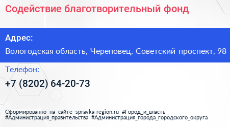 Содействие, благотворительный фонд по адресу Вологодская область, Череповец, Советский проспект, 98 в дальнейшем Организация, размещена в следующих категориях: