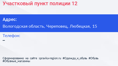 Участковый пункт полиции №12 по адресу Вологодская область, Череповец, Любецкая, 15 в дальнейшем Организация, размещена в следующих категориях: