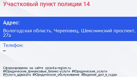 Участковый пункт полиции №14 по адресу Вологодская область, Череповец, Шекснинский проспект, 27а в дальнейшем Организация, размещена в следующих категориях: