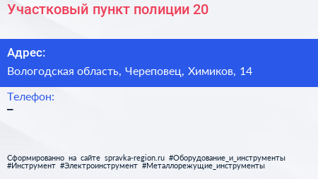 Участковый пункт полиции №20 по адресу Вологодская область, Череповец, Химиков, 14 в дальнейшем Организация, размещена в следующих категориях: