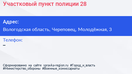 Участковый пункт полиции №28 по адресу Вологодская область, Череповец, Молодёжная, 3 в дальнейшем Организация, размещена в следующих категориях: