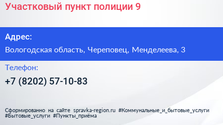 Участковый пункт полиции №9 по адресу Вологодская область, Череповец, Менделеева, 3 в дальнейшем Организация, размещена в следующих категориях: