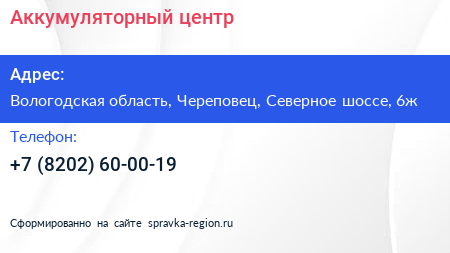 Аккумуляторный центр по адресу Вологодская область, Череповец, Северное шоссе, 6ж в дальнейшем Организация, размещена в следующих категориях: