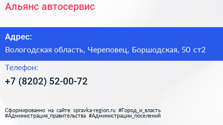Альянс, автосервис по адресу Вологодская область, Череповец, Боршодская, 50 ст2 в дальнейшем Организация, размещена в следующих категориях: