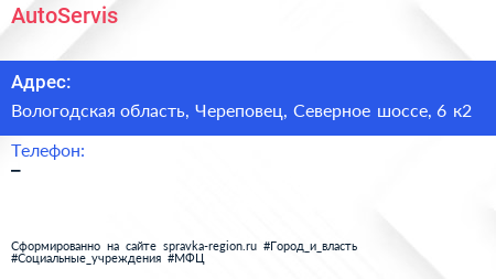 AutoServis по адресу Вологодская область, Череповец, Северное шоссе, 6 к2 в дальнейшем Организация, размещена в следующих категориях: