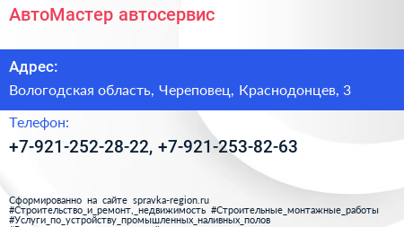 АвтоМастер, автосервис по адресу Вологодская область, Череповец, Краснодонцев, 3 в дальнейшем Организация, размещена в следующих категориях: