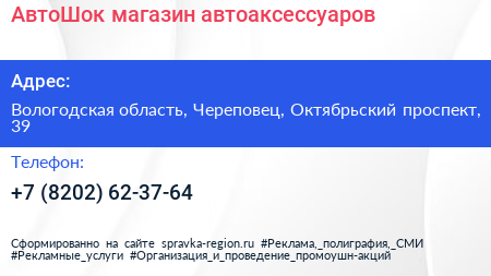 АвтоШок, магазин автоаксессуаров по адресу Вологодская область, Череповец, Октябрьский проспект, 39 в дальнейшем Организация, размещена в следующих категориях: