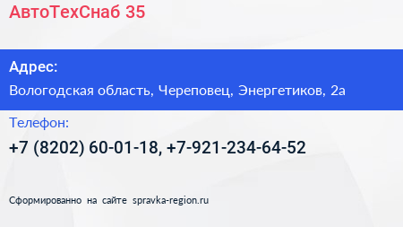 АвтоТехСнаб 35 по адресу Вологодская область, Череповец, Энергетиков, 2а в дальнейшем Организация, размещена в следующих категориях: