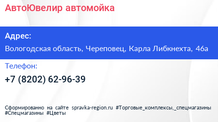 АвтоЮвелир, автомойка по адресу Вологодская область, Череповец, Карла Либкнехта, 46а в дальнейшем Организация, размещена в следующих категориях: