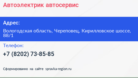 Автоэлектрик, автосервис по адресу Вологодская область, Череповец, Кирилловское шоссе, 88/1 в дальнейшем Организация, размещена в следующих категориях: