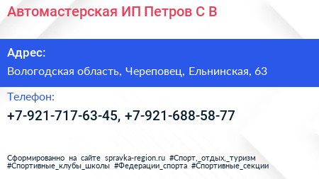 Автомастерская, ИП Петров С.В. по адресу Вологодская область, Череповец, Ельнинская, 63 в дальнейшем Организация, размещена в следующих категориях:
