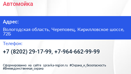 Автомойка по адресу Вологодская область, Череповец, Кирилловское шоссе, 72Б в дальнейшем Организация, размещена в следующих категориях: