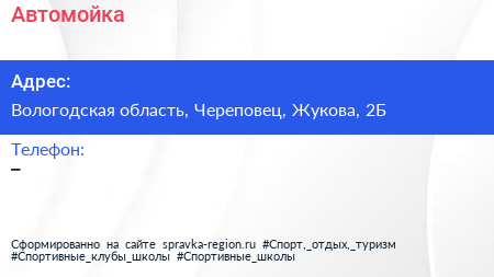 Автомойка по адресу Вологодская область, Череповец, Жукова, 2Б в дальнейшем Организация, размещена в следующих категориях: