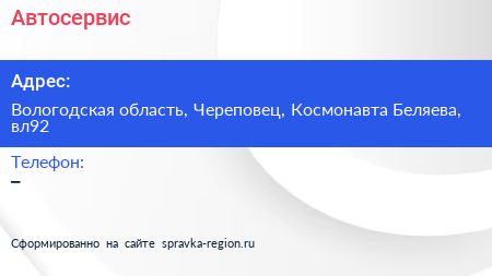 Автосервис по адресу Вологодская область, Череповец, Космонавта Беляева, вл92 в дальнейшем Организация, размещена в следующих категориях: