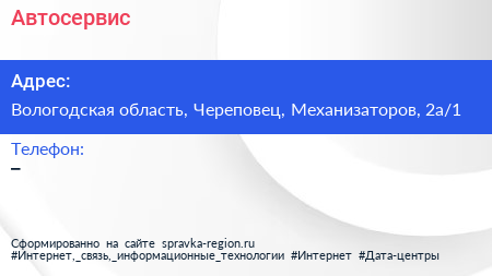 Автосервис по адресу Вологодская область, Череповец, Механизаторов, 2а/1 в дальнейшем Организация, размещена в следующих категориях: