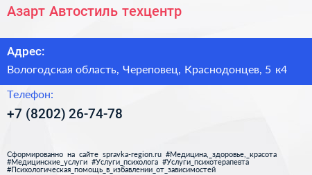Азарт Автостиль, техцентр по адресу Вологодская область, Череповец, Краснодонцев, 5 к4 в дальнейшем Организация, размещена в следующих категориях: