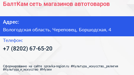 БалтКам, сеть магазинов автотоваров по адресу Вологодская область, Череповец, Боршодская, 4 в дальнейшем Организация, размещена в следующих категориях: