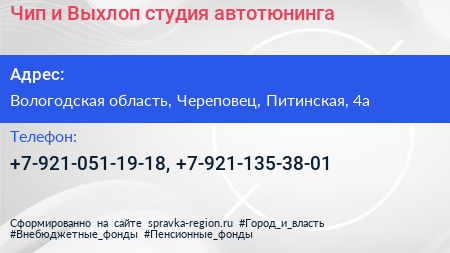 Чип и Выхлоп, студия автотюнинга по адресу Вологодская область, Череповец, Питинская, 4а в дальнейшем Организация, размещена в следующих категориях: