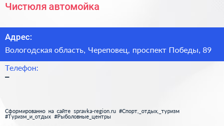 Чистюля, автомойка по адресу Вологодская область, Череповец, проспект Победы, 89 в дальнейшем Организация, размещена в следующих категориях: