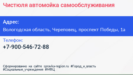 Чистюля, автомойка самообслуживания по адресу Вологодская область, Череповец, проспект Победы, 1а в дальнейшем Организация, размещена в следующих категориях: