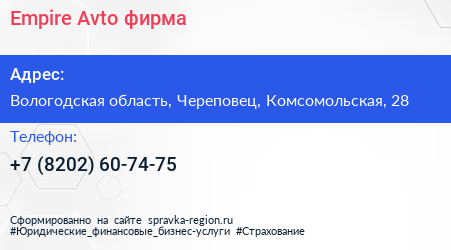 Empire Avto, фирма по адресу Вологодская область, Череповец, Комсомольская, 28 в дальнейшем Организация, размещена в следующих категориях: