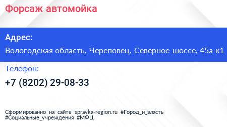 Форсаж, автомойка по адресу Вологодская область, Череповец, Северное шоссе, 45а к1 в дальнейшем Организация, размещена в следующих категориях: