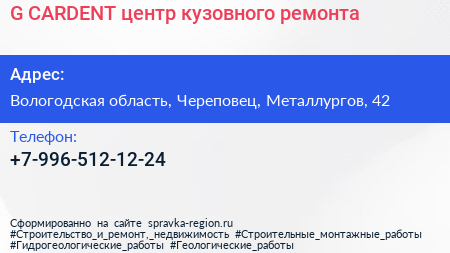 G-CARDENT, центр кузовного ремонта по адресу Вологодская область, Череповец, Металлургов, 42 в дальнейшем Организация, размещена в следующих категориях: