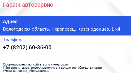 Гараж, автосервис по адресу Вологодская область, Череповец, Краснодонцев, 1 к4 в дальнейшем Организация, размещена в следующих категориях: