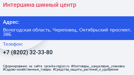 Интершина, шинный центр по адресу Вологодская область, Череповец, Октябрьский проспект, 38Б в дальнейшем Организация, размещена в следующих категориях: