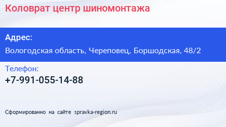 Коловрат, центр шиномонтажа по адресу Вологодская область, Череповец, Боршодская, 48/2 в дальнейшем Организация, размещена в следующих категориях: