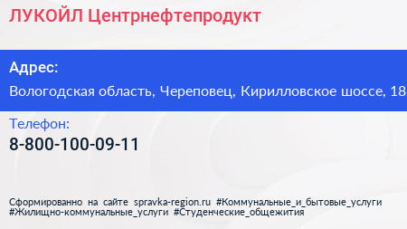 ЛУКОЙЛ-Центрнефтепродукт по адресу Вологодская область, Череповец, Кирилловское шоссе, 18 в дальнейшем Организация, размещена в следующих категориях: