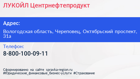 ЛУКОЙЛ-Центрнефтепродукт по адресу Вологодская область, Череповец, Октябрьский проспект, 31а в дальнейшем Организация, размещена в следующих категориях: