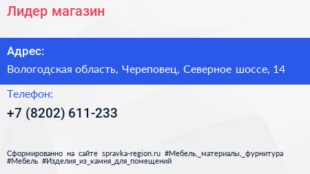 Лидер, магазин по адресу Вологодская область, Череповец, Северное шоссе, 14 в дальнейшем Организация, размещена в следующих категориях: