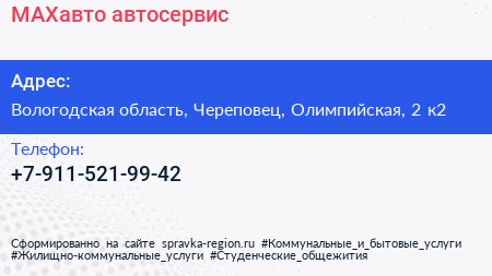 MAXавто, автосервис по адресу Вологодская область, Череповец, Олимпийская, 2 к2 в дальнейшем Организация, размещена в следующих категориях: