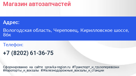 Магазин автозапчастей по адресу Вологодская область, Череповец, Кирилловское шоссе, 86к в дальнейшем Организация, размещена в следующих категориях:
