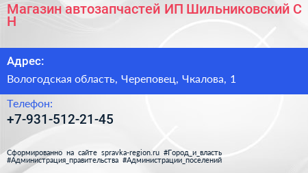 Магазин автозапчастей, ИП Шильниковский С.Н. по адресу Вологодская область, Череповец, Чкалова, 1 в дальнейшем Организация, размещена в следующих категориях: