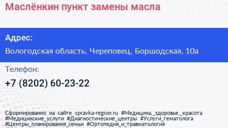 Маслёнкин, пункт замены масла по адресу Вологодская область, Череповец, Боршодская, 10а в дальнейшем Организация, размещена в следующих категориях: