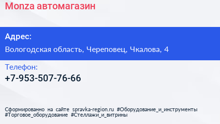 Monza, автомагазин по адресу Вологодская область, Череповец, Чкалова, 4 в дальнейшем Организация, размещена в следующих категориях: