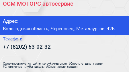 ОСМ-МОТОРС, автосервис по адресу Вологодская область, Череповец, Металлургов, 42Б в дальнейшем Организация, размещена в следующих категориях: