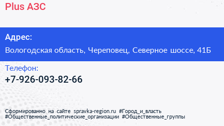 Plus, АЗС по адресу Вологодская область, Череповец, Северное шоссе, 41Б в дальнейшем Организация, размещена в следующих категориях: