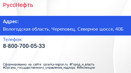 РуссНефть по адресу Вологодская область, Череповец, Северное шоссе, 40Б в дальнейшем Организация, размещена в следующих категориях: